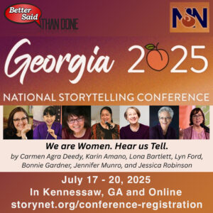 I am thrilled that Better Said Than Done has a Women’s Storytelling Festival showcase at the National Storytelling Network Conference in Georgia this July. Our showcase features storytellers Carmen Agra Deedy, Karin Amano, Lona Bartlett, Lyn Ford, Bonnie Gardner, Jennifer Munro, and Jessica Robinson. It really is a phenomenal lineup and I am thrilled to be sharing stories, and the stage, with these women.