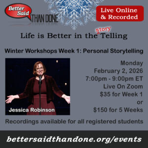 Join us online this winter for a series of storytelling workshops to warm your soul. Workshops led by Better Said Than Done Executive Director Jessica Piscitelli Robinson.