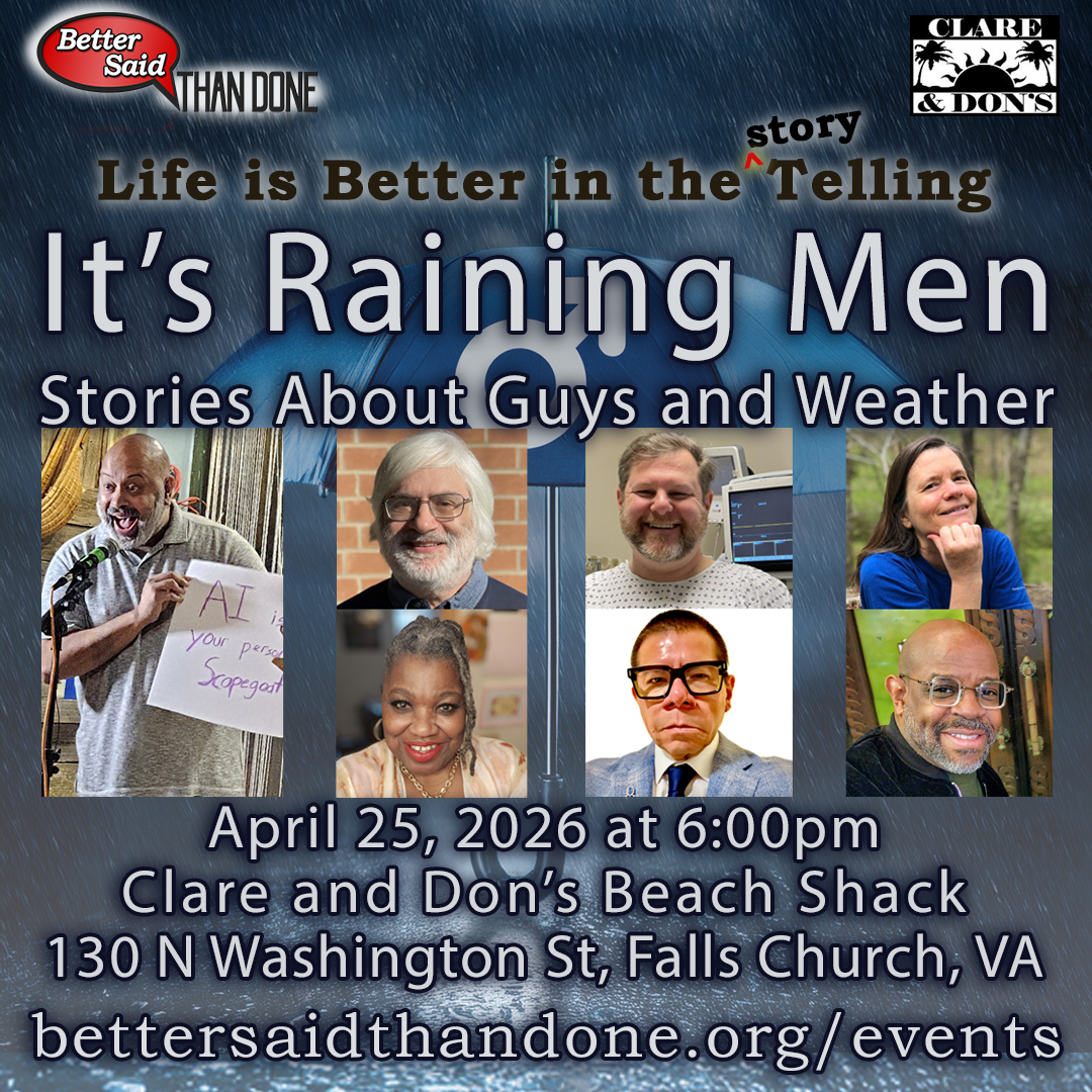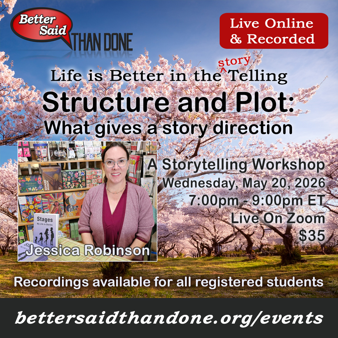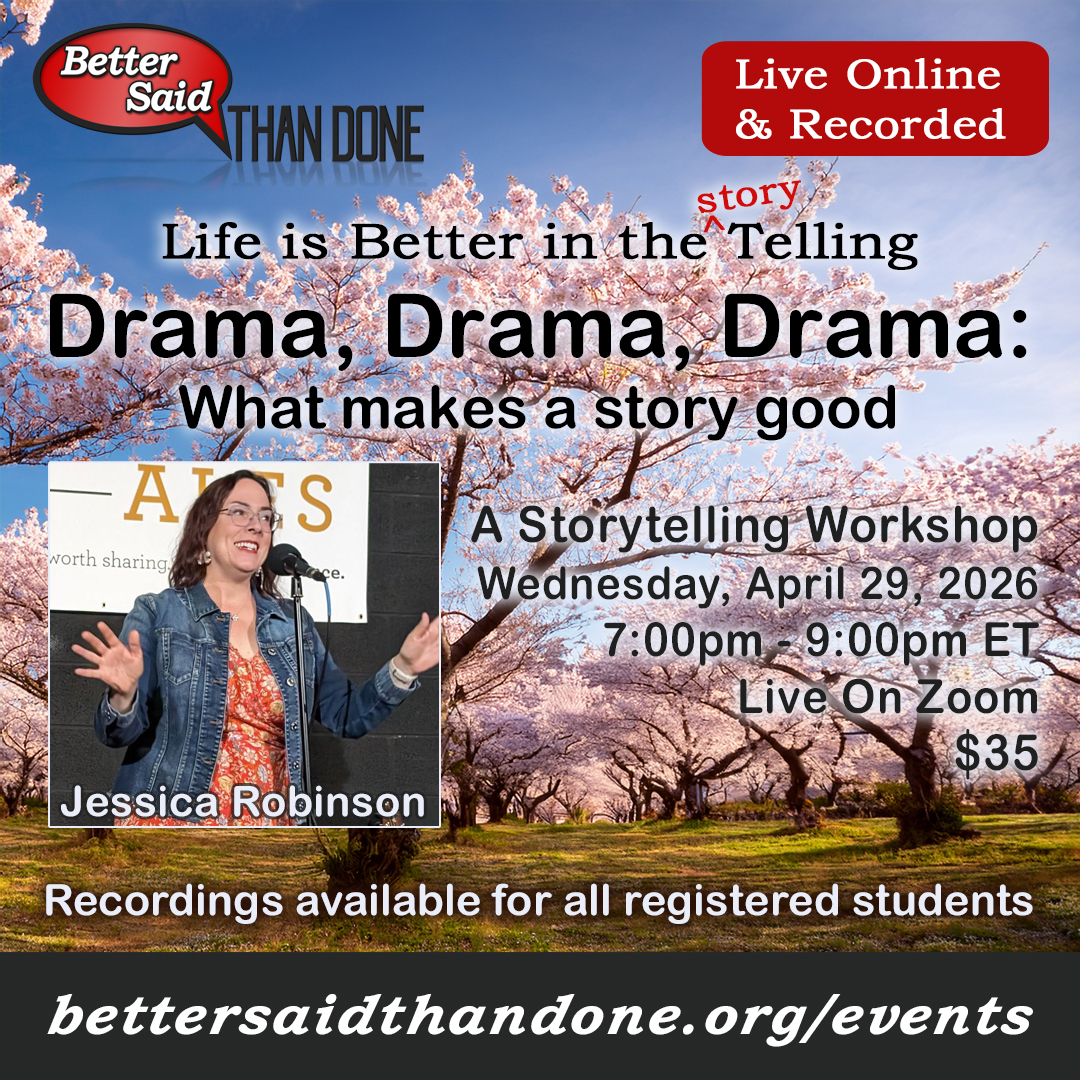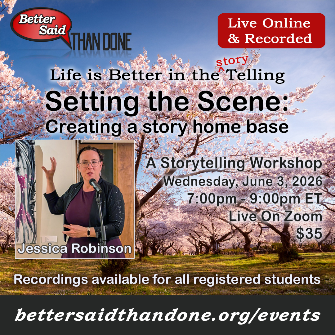 Join Better Said Than Done on Zoom on June 11, 2026 at 8:00pm for Stories of Love and Laughter.   Details and Tickets soon.