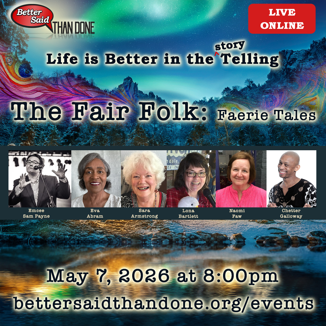 Join Better Said Than Done on Zoom on May 7, 2026 at 8:00pm Eastern for “The Fair Folk: faerie tales,” with emcee Sam Payne and storytellers Eva Abram, Sara Armstrong, Lona Bartlett, Naomi Faw, and Chetter Galloway. $15 Suggested/$5 MinimumAll Proceeds Split Between Producer and Storytellers You do NOT need a Paypal or Stripe account […]