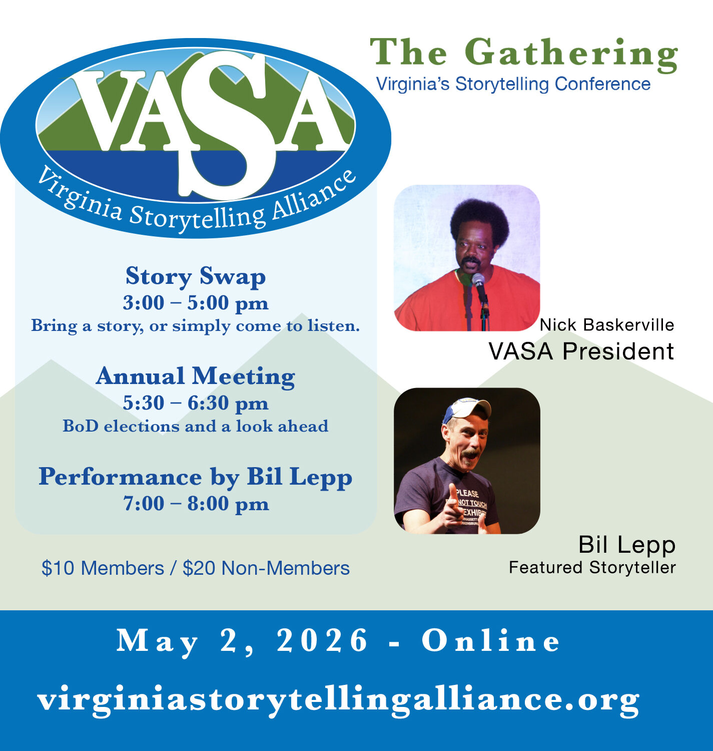The Virginia Storytelling Alliance (VASA) annual Gathering is online for 2026, making it easier than ever for members – and those who are curious about membership – across the state (and beyond) to join us for an afternoon and evening of stories, connection, and celebration. This special online edition of the Gathering will include a […]